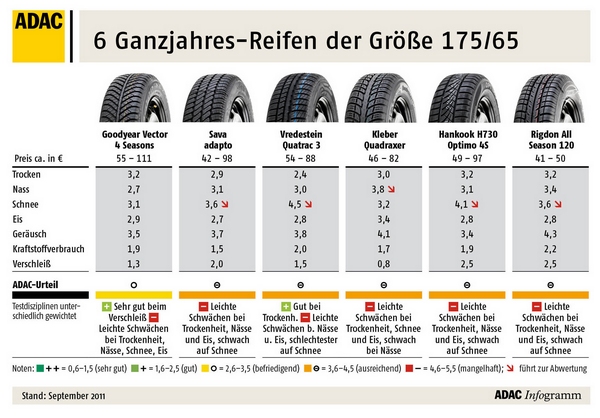 Da Ganzjahresreifen nur einen schwachen Kompromiss zwischen Sommer- und Winterreifen darstellen, empfiehlt der Club im Winter auf die Spezialisten umzusteigen und echte Winterreifen aufzuziehen. Nur sie bieten bei winterlichen Straßenverhältnissen den nötigen Grip. Der ausführliche ADAC Winterreifentest 2011 ist in der Oktoberausgabe der ADAC Motorwelt und im Internet auf der Seite des ADAC nachzulesen.“